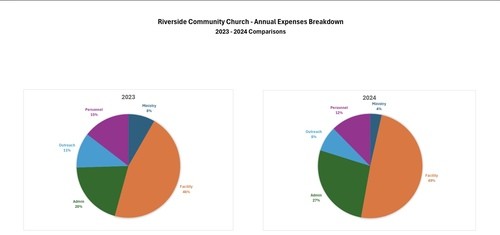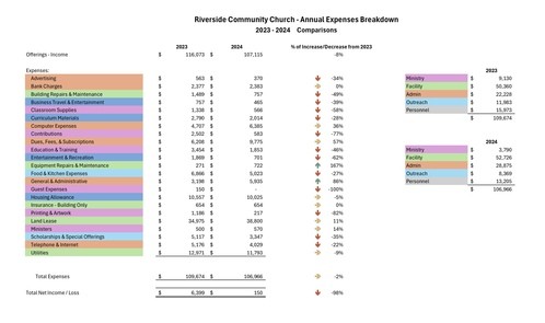 With this in mind, we as a church hope to build and maintain the trust, confidence and integrity of Riverside Community Church and its financial supporters, it is my desire as the lead Pastor to always provide as much transparency of our finances as possible. Below you can see the 2023 and 2024 expenses. - Pastor Selo Lozano